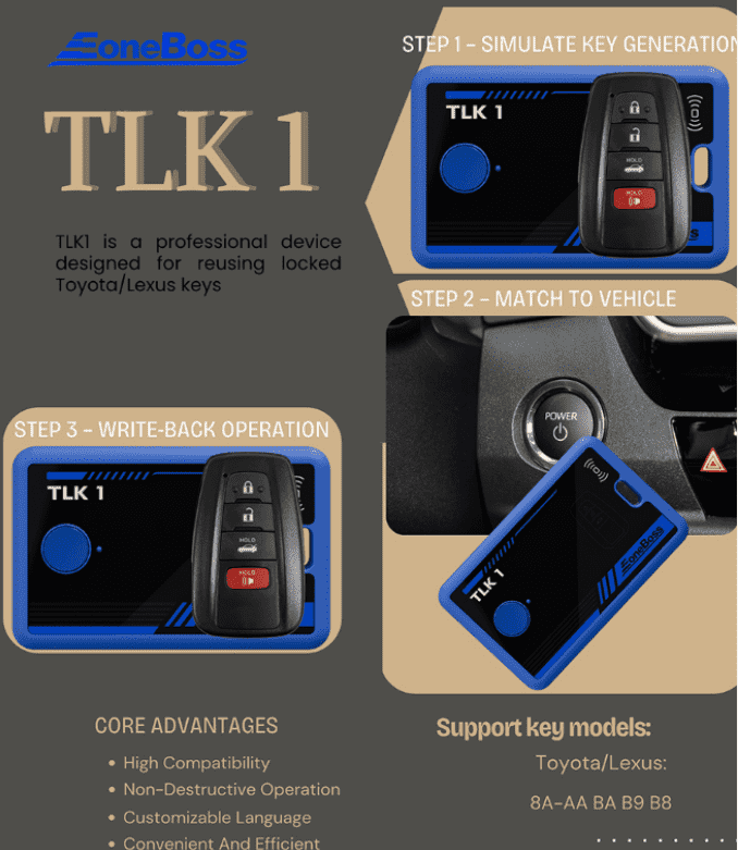 EONEBOSS TLK 1 is a professional device designed for reusing locked Toyota/Lexus keys. The TLK1 is a professional device dedicated to key reuse. It uses innovative technology to enable direct matching of used keys without unlocking them, effectively improving key reuse efficiency and reducing operating costs.
