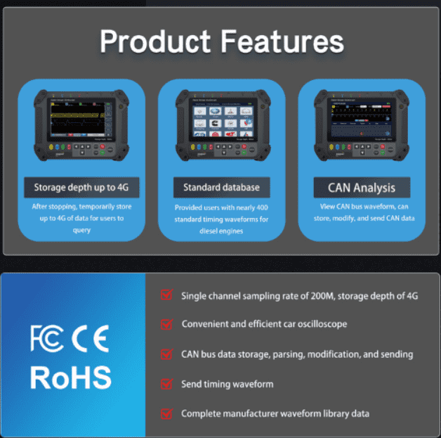 High-Capacity Data Handling : Features a massive 4GB storage depth, allowing for long-term, high-sample-rate data collection (e.g., for ignition signals) and enabling you to review over ten minutes of captured waveforms repeatedly.