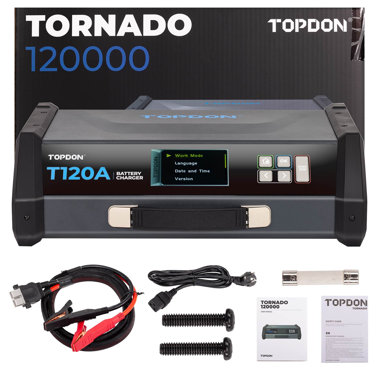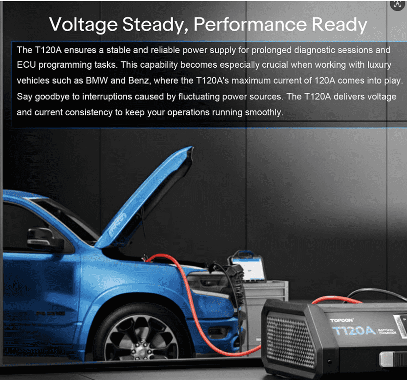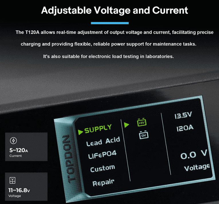 9-step smart charging, 120A max output, real-time voltage adjustment, ECU programming support |